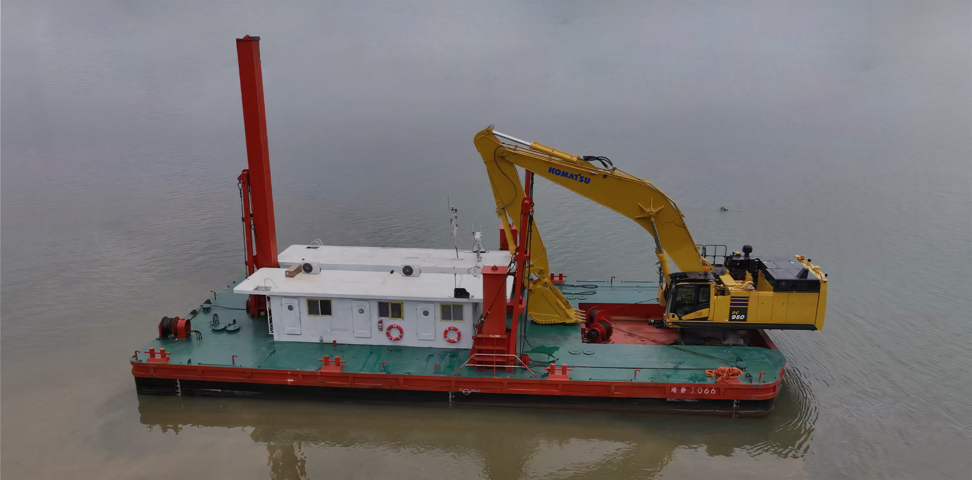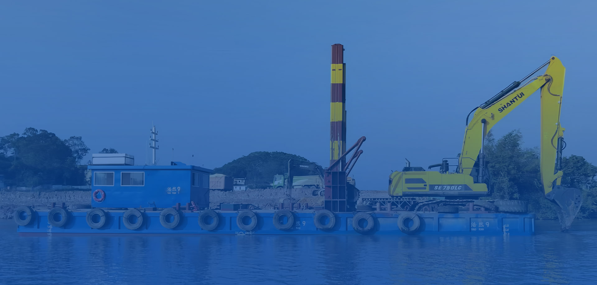 2、施工平臺穩(wěn)性強(qiáng),方便挖掘機(jī)在深水區(qū)施工作業(yè)。并且,平臺自帶航行動力,便于水上調(diào)遣。